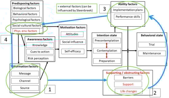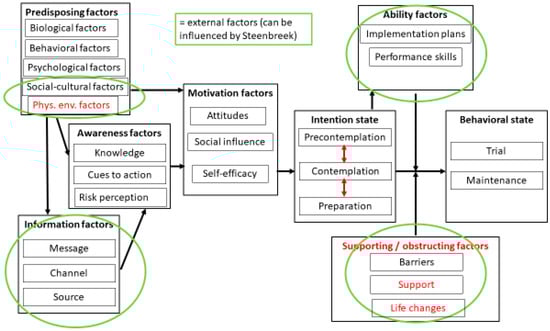 Garden greening behaviour model. An adapted EFSA model [28] with the adaptions in red. Physical environmental factors are added in the box ‘predisposing factors’. The original model is a medical model predicting behavioural change after, for instance, anti-smoking campaigns. In changing gardening behaviour the physical factor (size of garden, surrounding gardens, etc.) is also important. Life changes are added as factor that can strongly influence personal behaviour in greening the garden. Green circles depict the factors that we assume can be influenced by Steenbreek.