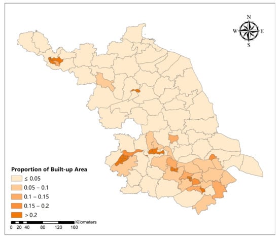 We extracted the urban land from the remote sensing monitoring data of Jiangsu Province in 2015 as the built-up area. The value of built-up area and non-built-up area was recorded as 1 and 0, respectively. First, we calculated the area of the built-up area, the proportion of the built-up area, and the global Moran’s I (see Section 2.1) of the built-up area within each district or county. We used these three indicators to represent urban spatial expansion size, development intensity, and distribution aggregation degree, respectively.