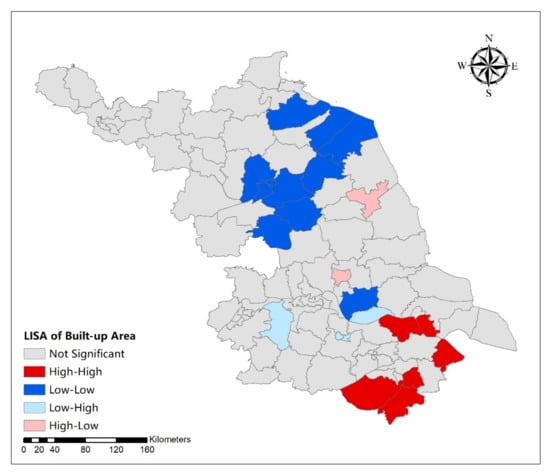 Local indicators of spatial association (LISA) (Local Moran’s I) cluster map of urban expansion size in Jiangsu Province.