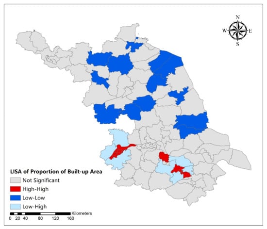 Local indicators of spatial association (LISA) (Local Moran’s I) cluster map of urban development intensity in Jiangsu Province.