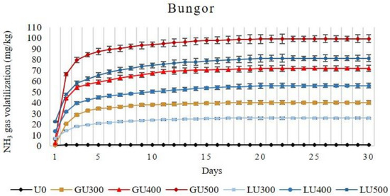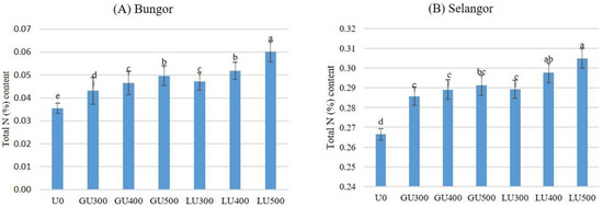 The total N remaining in the soils after 30 days of incubation was higher in the LU-than the GU-treated soils when compared at the same application rate. The total N remaining in the soil increased with the rate of application. In both LU- and GU-treated soils, the lowest amount of total N remaining was recorded in soils treated with 300 mg/kg urea and the highest was in the soils treated with 500 mg/kg urea. The amount of total N remaining in the soil increased with the rate of application in both LU- and GU-treated soils. The amount of total N remaining in the Selangor soil series are shown in Figure 5B. Similar to the Bungor soil series, the lowest amount of total N remaining in the Selangor soil series was found in soils treated with 300 mg/kg urea while the highest was in the soils treated with 500 mg/kg urea. The total N remaining in the Selangor soil series was higher in the LU- than the GU-treated soils; similar results were observed in the Bungor soil series. However, the total N remaining in the Selangor soils at the end of incubation was much higher than for both LU- and GU-treated Bungor soils. In the LU-treated soils, the NH4+-N and NO3−-N concentrations were higher than in the GU-treated soils, but the NH3 volatilization loss and remaining urea-N in soil was lower than in the GU-treated soils. Therefore, the total N remaining in the soils at the end of the incubation period was higher in the LU-treated soils. However, the total N remaining in the Selangor soil series at the end of incubation was much higher than for both LU- and GU-treated Bungor soils.