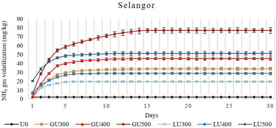 In Selangor soil, the accumulative NH3 volatilization loss increased with the increasing rate of application in both LU- and GU-treated soils. In the GU-treated soils, NH3 volatilization was low on the first day (1.87 mg/kg, 2.45 mg/kg, and 5.91 mg/kg from soil treated with 300 mg/kg, 400 mg/kg, and 500 mg/kg of GU, respectively), then rapidly increased on the second day (11.07 mg/kg, 14.33 mg/kg, and 22.47 mg/kg from soil treated with 300 mg/kg, 400 mg/kg, and 500 mg/kg of GU, respectively), and then decreased on the third day. Beginning from day 6, the NH3 was very low (1.69 mg/kg, 1.80 mg/kg, and 3.08 mg/kg from soil treated with 300 mg/kg, 400 mg/kg, and 500 mg/kg of GU, respectively), which continued until day 15. Similar patterns were observed for all application rates of GU. In the LU-treated soils, the NH3 volatilization was higher than in the GU-treated soils at all application rates. The NH3 volatilization loss from LU-treated soils on the second day (5.99 mg/kg, 8.68 mg/kg, and 13.39 mg/kg from soil treated with 300 mg/kg, 400 mg/kg, and 500 mg/kg of LU, respectively) was lower than the first day (6.67 mg/kg, 7.05 mg/kg, and 20.25 mg/kg from soil treated with 300 mg/kg, 400 mg/kg, and 500 mg/kg of LU, respectively). The volatilization loss continued until day 6, 9, and 11 of incubation for the LU300-, LU400-, and LU500-treated soils, respectively.