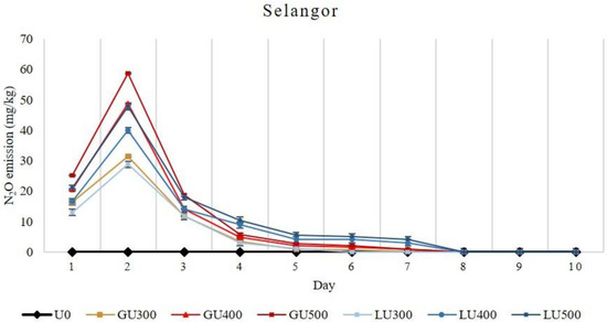 In the Selangor soil series, higher N2O emissions were found in the GU-treated soils than those of the LU-treated soils, and the N2O emission increased with the increasing rate of both GU and LU applications (Figure 4).