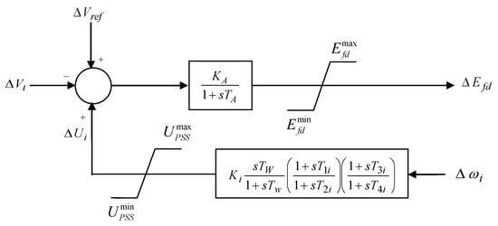 In this study, the conventional lead-lag PSS [] is adopted. As shown in Figure 1, the proposed PSS consists of a gain Ki, a washout bloc with time constant TW and two lead-lag blocks. The gain Ki corresponds to the value of the damping introduced by the PSS to mitigate LFOs. Theoretically, its value must satisfy the damping of the dominant modes of the system without running the risk of degrading the stability of the other modes or the transient stability. The washout bloc eliminates the LFOs presented in the input signal. It also removes the DC component of the input signal speed. Therefore, the PSS only reacts when there are variations in speed. The time constant of this filter must be large enough to allow the signals whose frequency is located in the desired band, to be transmitted without attenuation. However, it should not be too large to avoid leading to undesirable generator voltage variations. Generally, TW ranges from 1 to 20 s. A remarkable improvement on the stability of the first oscillation is obtained with a value fixed at 10 s []. To better ensure the stability of the system, a lead-lag block is mostly employed for phase compensation. Generally, two or more first-order blocks for phase compensation are mostly employed where the time constants T1 and T3 for phase-lead compensation and T2 and T4 for phase-lag compensation are adjustable. These time constants vary from 0.01 to 1.5 s []. In Figure 1, KA and TA are the amplifier gain and the amplifier time constants of the excitation system, respectively. Vref and Vt are reference and generator terminal voltages, respectively.