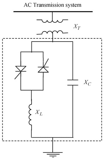 The SVC device used in this study is connected to the AC system via a set up transformer to maintain the network voltage constantly at a specified value by varying its effective reactance. As seen in Figure 2, the system is a thyristor-control reactor/fixed capacitor (TCR/FC). The firing angle of the thyristors controls the value of the effective reactance of the SVC, as written in the following equation [].