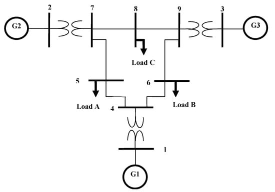To assess the effectiveness and robustness of the proposed COA-based controllers in the improvement of the power system stability, the 3-machine 9-bus WSCC (western system coordinating council) is considered in this paper. The single line diagram of the test system is given in Figure 5. The system data in detail are given in []. In this study, it is assumed that all generators except G1 are equipped with PSS. In order to determine the best location of SVCs devices, different strategies have been illustrated in the literature [,]. In [], two strategies based on studying the impact of load percentage and line outage on load bus voltages have been applied on the WSCC system. As given in [], bus number 5 is selected as the best placement for the SVC device in this paper.