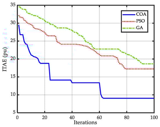 In order to find the optimum values of controllers’ parameters, the objective function given in Equation (7) is minimized considering two scenarios of severe fault disturbances under the loading conditions described above. In the first scenario, a 6-cycle fault disturbance is occurred in the line 5–7 close bus 5. The fault is cleared by tripping the line 5–7 with successful reclosure after 1.0 s. Scenario 2 is equivalent to scenario 1 with 0.2 per unit (pu) step increase in mechanical power. The fault is cleared by tripping the line 5–7 with successful reclosure after 1.0 s. Results obtained by using the proposed optimization method COA are compared with those obtained using genetic algorithm (GA) and PSO techniques to investigate the COA performance. For fair comparison, these algorithms were run with the same population size (80) and maximum number of iterations (100). The best results are obtained after 30 independent runs of the optimization techniques. Statistical results with 95% confidence interval for COA, PSO and GA are tabulated in Table 4. As it can be seen, the proposed algorithm reached the best results in terms of mean value of best cost and standard deviation. The convergence characteristics of these algorithms, when they are applied for the optimum setting of PSS and SVC controllers, are illustrated in Figure 6.