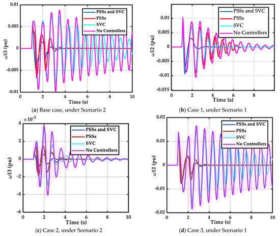 In order to show the contribution of the coordinated design compared to the uncoordinated design variations of the angular speeds, and for various loading conditions and under the fault scenarios 1 and 2 are shown in Figure 7. Note that and . Figure 8 shows clearly that POD-based SVC controller fails to provide a good damping of the system oscillation when applied alone. Moreover, PSSs regulators provide good damping of system oscillations with low settling time compared to SVC controller. However, the suggested coordinated controllers remain the most efficient in providing the best damping of oscillations and reducing their settling times.