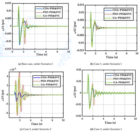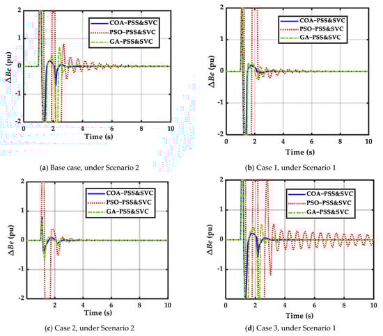 In order to further show the robustness of the proposed controller (COA-PSS&SVC), a comparison with GA and PSO techniques is performed in this sub-section. The parameters of the COA-PSS&SVC controllers are those given in Table 5, whilst parameters of PSO-based controllers (PSO-PSS&SVC) and GA-based controllers (GA-PSS&SVC) are taken from Table 6. Figure 9 shows the time responses of the speed deviations and when COA-PSS&SVC, PSO-PSS&SVC and GA-PSS&SVC controllers are applied, whilst averages of settling times corresponding to responses of speed deviation and under aforementioned cases are shown in Table 7. The time responses of the variation of the SVC’s susceptance () corresponding to the aforementioned controllers and operating conditions are given in Figure 8 and Figure 9. From these figures and Table 7, it is obvious that the proposed controller succeeded to outperform the other controllers and to reduce the settling times of the system oscillations under severe faults and over a wide range of operating conditions. Moreover, PSO-PSS&SVC and GA-PSS&SVC controllers failed in providing good damping of the system oscillation in some cases like in case 3 if fault scenario 1 is applied.