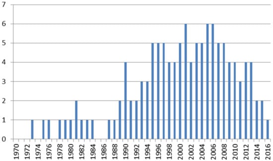 Fiscal rules reduce procyclicality of economy and maintain fiscal sustainability while meeting infrastructure needs. They also control the pressure to overspend during good times and ensure fiscal responsibility, prudence, and debt sustainability. A debt rule critically maintains long-run fiscal sustainability. Large-scale natural disasters significantly increase the probability of a sovereign debt default [14]. This is important because the Pacific island countries have experienced frequent sovereign defaults in history (Figure 1). To keep the debt-to-GDP ratio under certain limits, a budget balance rule should constrain the size of the budget deficit as an operational guide, backed by expenditure or revenue rules. Since expenditure is more controllable by the government than revenue, the expenditure policy is desirable to achieve a budget balance rule. Furthermore, investment-friendly rules are important for the Pacific Islands because of large infrastructure needs amplified by natural disasters/climate change. On the revenue side, it may be important to set a floor for revenue, so that the government can secure adequate revenues for policy objectives, and to determine the use of windfall revenues, especially for commodity exporters. Note that both revenue and expenditure have automatic stabilizer effects. Automatic stabilizers are actually located on the expenditure side in advanced countries [15]. This is also applicable to the Pacific Islands because countercyclical fiscal policy is mainly caused by inertia in discretionary expenditure: governments do no lay off officials, teachers, policemen or nurses during economic downturns, although some expenditure items that contribute to countercyclicality such as social insurance and unemployment benefits are not well developed in small states compared to advanced countries.
