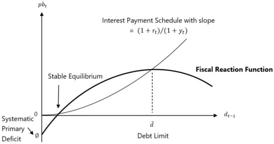 where is the primary balance, captures all systematic determinants of the primary balance other than lagged debt, are estimated coefficients on lagged debt level (), and is an independent and identically distributed shock to the primary balance. In this case, multiple equilibria emerge to determine the debt level as Figure 2 shows. Note that interest payments are assumed to increase nonlinearly as the debt level goes up. In this setting, the debt limit becomes .
