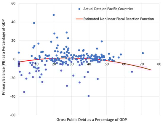 We use country panel data on Pacific Islands to find the debt-to-GDP ratio that maximizes the primary balance. There is a nonlinear relationship between the primary balance and debt ratio if the fiscal reaction function is assumed (Figure 2). An economic intuition is that a government displays fiscal fatigue, whereby its ability to increase primary balances cannot keep pace with rising debt [41]. Thus, fiscal fatigue, observed in the empirical literature, is the loss of capacity or intention by the government to control debt accumulation using its primary balance consolidation despite the debt ratio exceeds an unsustainable level [42]. As shown in Figure 2, the fiscal authority tends to respond nonlinearly to the debt level. For example, Vanuatu loosened fiscal policy in 2015, widening primary deficit by 3.7% of GDP despite the sharp increase in public debt-to-GDP ratio from 24.8% of GDP in 2014 to 34.7% in 2015. This was driven by the fiscal authorities’ intention for an ambitious infrastructure investment program. This action posed threats to debt and fiscal sustainability, raising the country’s debt distress rating, and it demonstrated the need for careful selection of projects and reprioritization of expenditure as well as revenue mobilization efforts to bring down the debt ratio on a declining path. In such nonlinear relationship between primary balance and debt level, the fiscal reaction function can be defined as follows.
