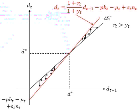 The debt dynamics in Equation (5) are shown graphically in Figure 4, for the case where the real interest rate is higher than the growth rate. This is a case when debt could diverge from the steady-state value . Note that we do not analyze the case where the real interest rate is lower than the growth rate because in this case the debt dynamics automatically converges toward the stable steady-state debt level over time and hence there is no need for fiscal policy rule. Thus, it is crucial to have the debt level below the steady-state value to keep debt sustainable. We do not worry about the case where the debt diverges toward zero because it is unrealistic. represents the long-term historic average of the impact of disasters. This approach is a straightforward way to include the effects of natural disasters when considering debt sustainability in the long term. An economic intuition is that the amount can be understood as a debt buffer against natural disasters. Note that steady-state parameters can be affected by the governmental activity. For instance, the government can choose the primary balance () in the steady state to change the steady-state debt level (). In this sense, we can think of the primary balance as a choice variable for the government. Another approach to calibrate the debt target is by doing stochastic simulations (via e.g., VAR) to know the debt threshold over which the debt becomes unsustainable. However, due to limited availability of economic data in the Pacific island countries, this approach is not practically useful.