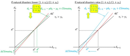 We also analyze the effects of permanent natural disasters or climate change shocks on debt dynamics because the ex-ante optimal fiscal rule is no longer sequentially optimal in the presence of persistent shocks [47]. We analyze two cases because the impact of disasters on economic growth and the risk premium is ambiguous. The existing literature finds that the effects of natural disasters on economic growth can be either negative or positive [48,49]. Although it is likely that climate change or natural disasters affect economic growth negatively in the long term, some empirical studies found positive effects. For example, climate disasters are positively correlated with long-run economic growth rates and higher total factor productivity [50]. Moderate disasters (such as moderate flooding) can have a positive impact on medium- and long-term economic growth [51]. Floods have positive effects on agriculture through benefiting land productivity [52]. Catastrophic natural disasters do not have a significant effect on economic growth in either the short or long term [53]. By contrast, very large earthquakes and some meteorological disasters negatively affect the growth rate of real GDP per capita [54]. Natural disasters can also affect country risk premiums. Geophysical and meteorological disasters (e.g., earthquakes, tsunamis, volcanic eruptions, and storms) increase the sovereign risk premium, whereas hydrological and climatic disasters (e.g., flood, droughts, and wildfires) do not affect the premium in the long term [55]. Therefore, the effects of natural disasters on growth and interest rates in the steady state are somewhat ambiguous in general. However, it is likely that natural disasters have adverse growth impacts on low-income countries like Pacific Islands, given their limited reconstruction capacity in the aftermath of disasters.