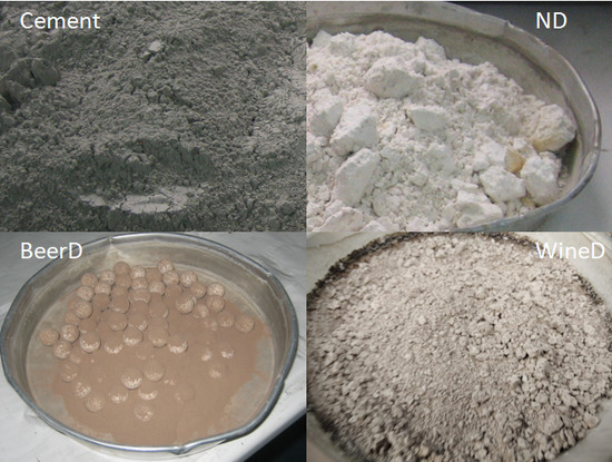 The chemical composition realized by X-ray Fluorescence (XRF) is presented in Table 1 for different diatomite samples. Diatomites are high in silica, carbonates, and soluble impurities; therefore, their pozzolanic activity is related to their silica component in the vitreous state. To determine the volatile components, including the organic matter content, loss on ignition (LOI) at 1100 °C of the diatomites before and after the filtration process was performed. Table 1 shows the results of LOI and the percentage of active silica. Seen in the Table, the organic matter content of the BeerD was high (2.92%) and could cause setting inhibition problems. Therefore, a heat treatment was used on the recycled diatomites (900 °C for 2 h). This procedure also allowed us to increase the reactive silica [14], as can be seen in the results obtained. Recycled diatomites without heat treatment were dried for two days on the stove at 60 °C. All cementitious materials (cement, ND, BeerD, WineD) used in the study are shown in Figure 1.