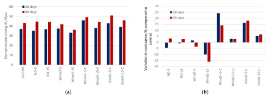 The use of untreated recycled diatomites (wineD) maintains the strength regarding the control concrete for up to 5% substitutions. When the percentage is increased to a 15% substitution, there is a 15% loss of strength at 90 days. Looking at the high silica content, the percentage of reactive silica, and the fineness of these diatomites compared to natural diatomite, another behavior would have been expected. The main cause explaining these results is the organic matter content of WineD (0.04%), which partially inhibits setting of the cement. Regarding the case of BeerD samples with a higher organic matter content (2.92%), it was observed in previous tests that the samples did not set, confirming this hypothesis. During another study [22], where 5%, 10%, and 15% of brewery-spent untreated diatomite were used, the obtained results were similar to those obtained in this study. The use of untreated recycled diatomite at up to a 5% substitution did not produce strength losses, and even produced improvement.