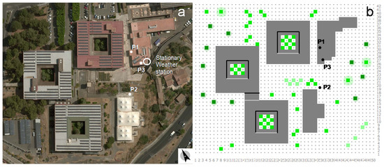 Position of the receptors P1, P2, and P3: (a) real geometry; (b) ENVI-met model.