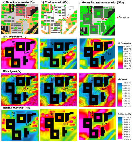 In the same way, two receptors (S1 and S2) have been selected to investigate locally the variation of microclimate and thermal comfort under the three proposed different scenarios (see Figure 5).