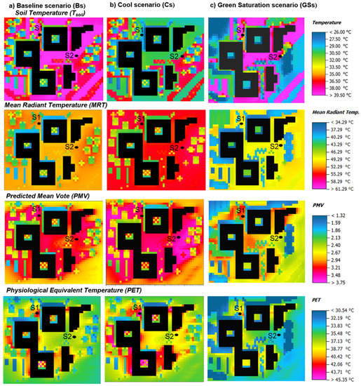 Again, overall, Figure 16 shows that the best results are achieved by the Green Saturation scenario (GSs), which has the lowest of value To, MRT, PMV, and PET. These results are attributable to the synergic effect of shading and evapotranspiration processes. On the other hand, the Cool scenario (Cs) has the worst performance even with respect to the Baseline scenario (Bs), for all the mentioned parameters, with the exception of To.