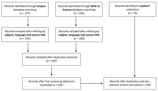 This process, as illustrated in the Prisma diagram in Figure 1, identified 242 potentially relevant publications. A first screening step was performed considering titles and abstracts, reducing the list to 102 publications that were fully screened. This structured process identified 74 relevant publications that were not included in the initial compilation of known research (items included in authors’ collections and identified via unstructured search). In the next step, all references cited by the identified articles were screened for relevance. The entire process identified 144 articles.