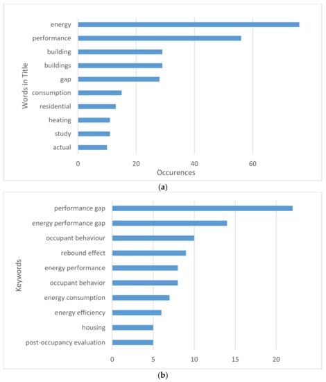 The vast majority of the studies (90%) mentioned in this review were published after 2010. Only a few papers (10%) were published prior to 2010 (Figure 2). Specifically, the scientific production in the 2015 to 2020 period was twice as high as the preceding five-year period (2010–2015). Most of the papers were published in the journals “Energy and Buildings” (33%) and “Building and Environment” (10%). The most frequently used words in the papers’ titles were as follows: energy (53), performance (43), building or buildings (33), gap (20), consumption (10), actual (9), analysis (8), occupant (8), evaluation (7), residential (7), impact (7). Figure 3 illustrates the most frequently used words in the papers’ titles as well as the frequency of included key words.