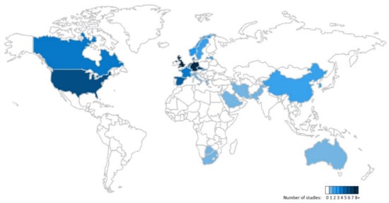 This review encompasses studies from 26 different countries (Figure 4). The vast majority (78%) of the studies include data gathered in Europe, with the largest number of studies from the United Kingdom (25). Other studies originated from the United States, Canada, Iran, Pakistan, Saudi Arabia, Kuwait, China, South Korea, Hong Kong, Australia, South Africa and Botswana. Most studies were conducted in temperate climates. A few studies were conducted in an arid climate with very dry and hot summers (Australia, Saudi Arabia, Kuwait, Pakistan, Iran and Botswana), a subtropical climate with hot and wet summers (Hong Kong, China, South Africa) and a Mediterranean climate with hot, dry summers and cool, wet winters (Italy, Greece, South Africa). Most studies were conducted in Western countries. As such, other building contexts, related lifestyles, and occupant densities appear to be under-researched.
