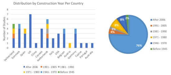 The construction year of the buildings is relevant to the applicable building directive or building code. Approximately 48% of the reviewed studies recorded relevant information about the building construction year and other timelines relating to renovations and retrofitting. In Figure 5, the studies are organized based on the construction year and country. Approximately 76% of the studies were conducted on buildings constructed or retrofitted after 2006, followed by the studies conducted on buildings built between 1971–1980 and 1946–1970 (with approximately 8% each). However, it should be pointed out that this statistic is not indicative of the number of buildings considered by the individual studies. In cases where studies span several locations with relevant year of construction data such as in [78], they have been associated with their corresponding countries.