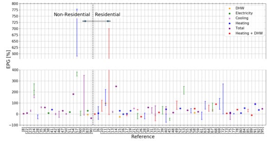 The reviewed studies did not report the EPG consistently. For example, some studies reported EPG as a percentage or in absolute terms in units related to total energy or area-normalized energy use, while a few reported their results in terms of CO2 emissions (e.g., [8]). Some studies reported gaps with respect to total building energy consumption, while others reported detailed gaps for one energy source (e.g., natural gas or electricity). Another group of studies focused on the energy end use (e.g., domestic hot water, heating, cooling), but this approach was typically used when studies compared the performance of different functional units such as a whole building compared to an apartment or commercial unit (e.g., [15,37,49]).