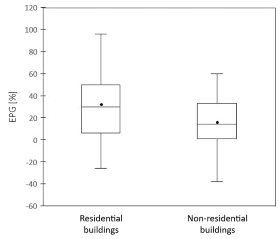 Distribution of EPG (in %) for residential and non-residential buildings.