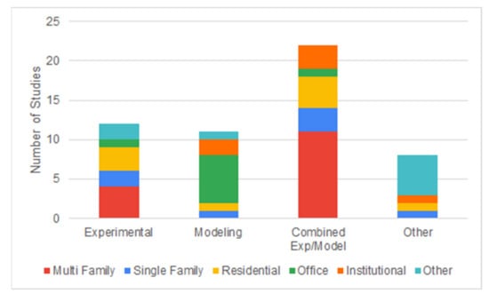 From 64 papers that reported data on energy-related measurements, parameters such as type of the demand (heating, cooling, ventilation, plug loads, lighting, etc.), measured energy type (electricity, gas, heating demand, etc.), the source of data (bills, metering, etc.), as well as spatial and temporal granularity information were included to some extent. Energy data are not consistently reported. Some cases document final energy (electricity, natural gas, heating oil, etc.), whereas others mention net energy (space heating and cooling loads, domestic hot water). Electricity was primarily used for lighting, plug loads, appliances, and auxiliary equipment of the HVAC system. The most common sources of energy data were bills (electricity, gas consumption) and data from principal meters and submeters. There were very few studies (7%) that had dedicated energy use metering [15,37,66,83,87].