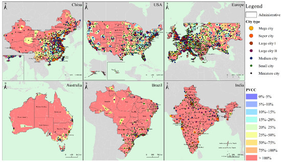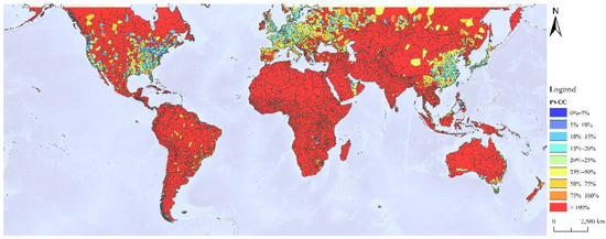 The assessment result of each urban division worldwide is shown in Figure 1. In addition, the annual PV power generation from all urban divisions would take up in a total ratio of 43.22% to the global electricity demand. Considering that over 30% of this power output might not be used directly or even wasted because of intermittence and electrical-surplus in off-peak period, this assessment result is relatively reasonable. In addition, it can be seen from Figure 1 that the vast majority of PVCC are provided by deserts, tundra and other sparsely populated areas in the form of ground utility scale PV station. Unless absolutely necessary, these sparsely populated areas are always suggested to better remain unexploited to protect their ecology and biodiversity. Generally, it is not essential to discuss the PVCC of these areas in priority. Therefore, by utilizing a regulation applicable in China [37], the standard of urban scale with a population of 50,000 is adopted in this study to distinguish urban and non-urban areas. On this basis, the average level of PVCC in urban areas worldwide could still reach up to 23.13%, nearly approaching the target of 25% by 2050. In other words, the global PV target of 2050 could be almost achieved only by PV installation in urban areas themselves together with methods such as low-priced energy storage and electric vehicles recharging (to avoid electrical-surplus), though this is just on the basis of global average level.