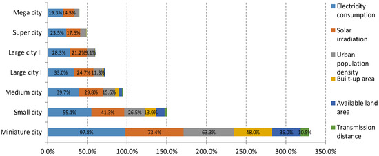 As mentioned above, the PVCC of a city will change with its influence factors. This section analyses the sensitivity of PVCC result to changes in the influence factors inputs. While considering the effects of different urban types to analysis accuracy, these analyses are conducted separately by different population scales based on a classification standard of China [37], specifically including seven scales that range from miniature city to mega city. For each type of urban scale, the median value of each influence factor is extracted as an assumed global average standard input into the PVCC equation. It is then adjusted independently of the others by ±50% (theoretical maximum and minimum) to observe its sensitivity and the results are shown in Figure 2. These analyses will further help to illustrate how different optimization strategies could make changes on the PVCC result, according to Table 1.