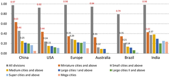 The total PVCC of 23.13% in urban areas worldwide would approximately meet the development needs in 2050, but this is just from the view of total average. As is shown in Figure 1, the PVCC of different urban divisions are actually changing in varying degrees. That is also to say, in order to achieve the appropriate proportion of PV energy consumption in each urban division, long distance energy allocations are inevitable, but this would definitely break the key quality of low transmission distance and high-efficient local utility of future energy systems. In order to describe this imbalance distribution of PVCC, six countries (or regions) are extracted as the contrasting analyses in this study, being: China, USA, Europe (partial), Australia, Brazil and India. The equilibrium of the PVCC distribution can be quantified as a “Gini index” which is commonly used as an indicator to measure the income gap of residents in a country or region. As shown in Equation (6), the Gini index is a value between 0 and 1, where 0 indicates the absolute equilibrium distribution of PVCC and 1 indicates the totally unequal distribution and 0.4 is generally used as the warning line to make a distinction between equilibrium and inequilibrium according to the definition of United Nations [38].It is worth noting, however, that the Gini index will change with the selected objects that are taken into calculation and that, according to the results of global assessment, the PVCC would usually decrease with the increase of urban population. Therefore, the equilibrium analysis of each county is conducted in the range of different urban scale sections, such as miniature cites and above and small cities and above (shown in Figure 3), and this would be used to discover in which section the largest distribution gap will occur. By combination then with the average level of PVCC and annual energy acquisition per capita in each urban scale (shown in Table 2), this would help to make further discussions on the adjustment strategies of the PV spatial planning in each country or region.