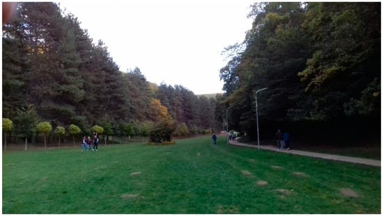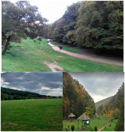 Based on the Law on Nature Protection, article 19, point 3, and the natural values of this area, the Kosovo Institute for Nature Protection proposes to the Municipal Assembly of Pristina to review this professional proposal and to make a decision, as in point II for the re-categorization of the regional natural park “Germia” in the category Protected Landscape, and expand the area of the protected area that will be included in the new borders of the Protected Landscape. The number of citizens visiting the Park of Germia reaches 1 million within a year [7,9,26,27]. Some of the activities and scenery from the Germia forest and recreational park are presented herein, and they show both leisure and forested ecosystem (Figure 3, see Appendix A). Inside the park, there is also a camp and a swimming pool, including a children’s pool, as well as the offices of the Directorate for Park Management.