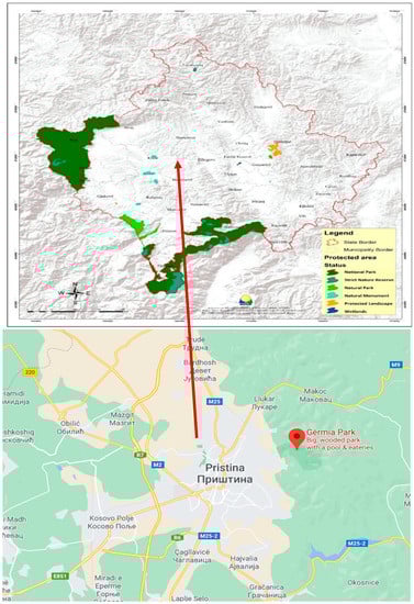 Germia regional forest Park is among the 173 protected areas (PA) in Kosovo. It gained PA status in 1987 (GZK number 43/87) from the Pristina municipality. The forest park covers an area of approximately 1064 hectares. Kosovo has been doing well in its management of forest and recreational parks, irrespective of its instability. Pristina is vital for the neighboring population, citizens, and tourists from the neighboring countries because of the Germia regional forest Park and its associated ecosystems services [7,8,9]. Moreover, the forest park ecosystem’s natural values have been increasing over time in terms of biodiversity, that is, the park’s major biodiversity species, both flora and fauna [7,8,9]. There are suggestions to further increase the size of the park, given the human demands that are threatening the values of the forest ecosystem and biodiversity, hence minimizing dangers on the PA status of the park [7,8,9].