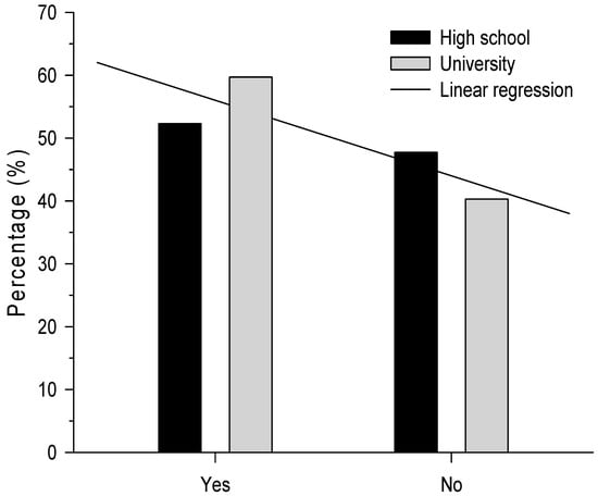 It should be noted that most participants during the survey expressed that the quality of services should also be improved, which would also increase their readiness and willingness to pay. The WTP with the education levels of respondents showed that 52% had high school education, and 60% had university education. Overall, 48% of the respondents who had high school education were not willing to pay and 42% with a university education were not willing to pay for recreational services for the sustainable management and development of the recreation park in Germia (Figure 8). At both studied levels of education, most were willing to pay for recreational services for sustainable management and development of the recreational park in Germia (Figure 8).