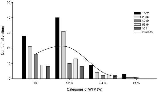 Figure 9 shows the willingness to pay as percentages (%) of tax of the respondents’ income that were categorized as (0%, 1–2%, 3–4%, >4%) and this was subdivided into the age categories (18–25, 26–39, 40–54, 55–65). Ages 18–25 represented 14% of the total interviewed in this category who were willing to pay tax from their salary. In total, 19% of the total participants in this category were willing to pay 1–2% tax from their salary. In total, 4% of the total respondents in this category were willing to pay 3–4% tax from their salary. In total, 1% of the total participants in this category were willing to pay >4% tax from their salary.