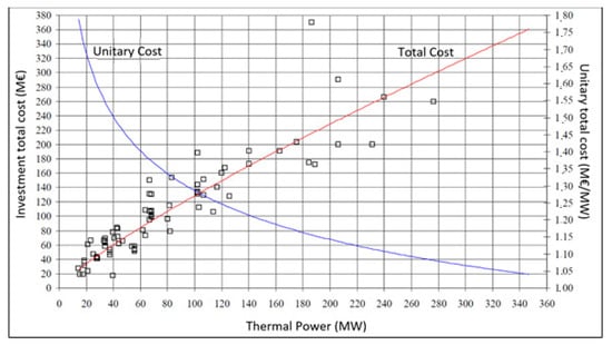 Obviously, the costs depend on the plant size. By analyzing the literature [24,25], it is possible to note that the costs reported in Table 7 fall down into the literature range (Table 8 and Figure 1).