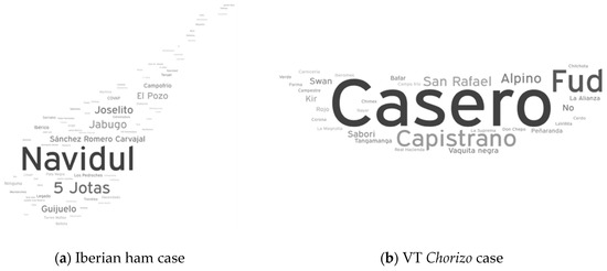 Therefore, corporate identities are a very relevant segment of the confidence transmitted by a brand and presently, they are considered one of the bases for the consumer´s recognition of agri-food quality (Figure 2). In the case of Iberian ham, the primary brand that consumers remember (Navidul, represented with a larger font size) is the most mentioned by consumers when they are asked to name the first jamón brand that comes to their mind. Even if it is true that they remember other brands from the Iberian sector such as 5 Jotas or Joselito, those dominantly positioned are the ones that have powerful marketing strategies supported by their corporate identities. In the case of VT chorizo in Mexico, fewer than 4% of the producers have a corporate identity [18] and the term home-made (casero) is the one that appears most frequently. Even so, words such as Capistrano, Fud, San Rafael, and Alpino are also mentioned; all of them being chorizo brands outside these territorial dynamics.
