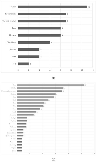 The results presented herein form part a broader research project. So, in this paper we only use the open questions. This section was designed to ask for information about the food quality and particular information of food products according to the free word association technique [66]. With the aim for participants to mention the first word coming into their mind for relevant variables analysed herein after. We used this technique according to Ares, Giménez and Gámbaro [67], and Guerrero et al. [66], the first word expressed by consumers shows not only their perception, but also the word most positioned in the subconscious of a person related to a food product. We do not use any pre-established categories of analysis. Each word was obtained from participants and was analysed by the coding and triangulation of information among researchers [68].