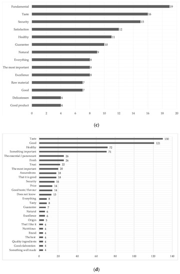 Notions of the quality in food from producer and consumer of both LAS. (a) Producers of VT chorizo, (b) Consumers of VT chorizo, (c) Producers of Iberian ham, (d) Consumers of Iberian ham.