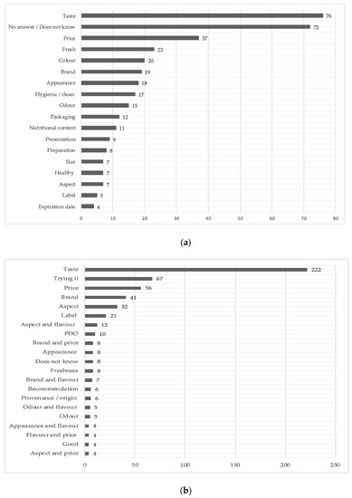 In the case of Iberian ham, beyond the relevance of taste as a narrow concept, we found that trying the product, price, brand, appearance, and label are the main reasons why a food is identified as a quality product in Spain. It is worth mentioning that the PDO and the origin are among the barely significant factors respondents explain the way in which they can identify the quality of the product (Figure 4); replies that do not come from only asking for one word that defines quality for them.