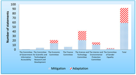 The committee with the most statements regarding renewable energy as a tool for coping with climate change was the Science and Technology Committee (41 statements constituting 45% of all statements), which, by its definition, is supposed to deal with such issues. Participants in this committee’s discussion gave balanced attention to both mitigation and adaptation. Other committees in which the number of statements was relatively high are the Economics Committee (21 statements constituting 23% of all statements) and the Interior and Environmental Protection Committee (16 statements constituting 17% of all statements). However, the statements in these committees were significantly biased in favor of mitigation considerations. Most of the other committees exhibited similar results, though the total number of all statements on renewable energy was relatively low.
