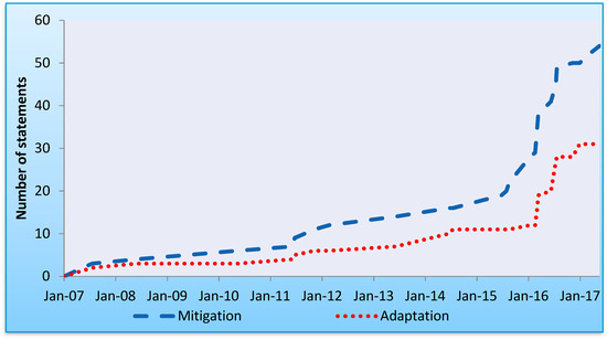 The results were also categorized according to the total number of relevant statements to renewable energy over time, as can be seen in Figure 3. The total number of statements, regarding both adaptation and mitigation, increased between 2007 and 2017. This indicates that renewable energy garnered more interest among policy-makers as a tool for coping with climate change. While statements regarding both adaptation and mitigation strategies increased over time, mitigation statements continued to be mentioned more often than adaptation statements over time, without any noticeable trend-differences over the years.