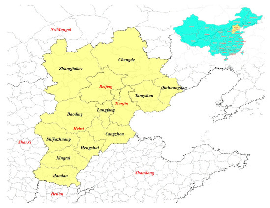 Taking the Beijing–Tianjin–Hebei region as the research area (Figure 1), this study explores the mechanism and spatial differentiation of the coordinated development of urbanization. This can provide scientific guidance for establishing coordinated internal subsystem mechanisms and regulating key points of urbanization in hot areas, and has important theoretical and practical significance for enriching new urbanization theory and promoting the comprehensive, coordinated and sustainable development of the region.