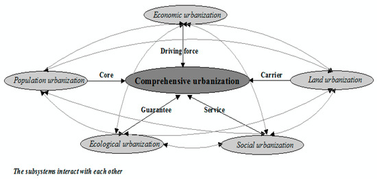 As a comprehensive concept, urbanization includes not only the concentration of the population and the transformation of a non-agricultural economy in cities and towns, but also the shaping and evolution of the abstract spirit of urban culture, values, production and lifestyle and the construction and evolution of the urban landscape ecosystem in specific areas [24]. According to the theory of system coupling, if there is an interactive relationship between elements in a system, it can be considered that there is a coupling phenomenon between them, and a coupling coordination state can be formed by guiding benign and positive interactions between the elements [10]. According to the content of this study, the internal elements of urbanization interact with and influence each other, which has the characteristics of system coupling. The purpose of coordinated development of urbanization is to guide all kinds of elements to achieve a coupled and coordinated state. Therefore, from the perspective of system coupling, this study deconstructs urbanization from five dimensions: population, land, economy, ecology and society [5,7,21,24,25].