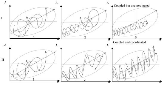 Conceptual model of coupling coordination theory. Note: ”I” and “II” represent two different coupling processes, “I” represents low-level coupling process, “II” represents coupling coordination process.
