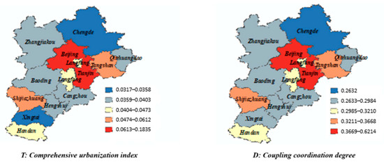 Spatial differentiation of comprehensive urbanization index and coupling coordination degree in Beijing–Tianjin–Hebei region in 2017.