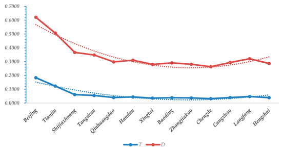 The comprehensive urbanization index of the Beijing–Tianjin–Hebei region has a spatial pattern, with high values in Beijing–Tianjin and low values in the surrounding areas (T, Figure 5). Beijing and Tianjin have high values for economic development, land input and output, population concentration, ecological governance, social services, etc. The comprehensive urbanization index values are higher than 0.1000, and the value for Beijing is close to 0.2000. The comprehensive urbanization index of Tangshan and Shijiazhuang has values higher than 0.0500, and the value for Langfang is close to 0.0500. The values for Tangshan and Langfang are similar to those for Beijing and Tianjin, and the transfer of industry and technology provides the economic basis for comprehensive urbanization. Shijiazhuang has high values for the population and land urbanization indices due to the advantages of being Hebei’s provincial capital. Tangshan and Langfang have relatively high comprehensive urbanization index values. In addition, the surrounding areas of Beijing and Tianjin are developing at a low level, which shows that the comprehensive urbanization development of Beijing and Tianjin has a weak radiation driving effect on the surrounding areas. The comprehensive urbanization index for Handan, Xingtai, Baoding, Cangzhou and Hengshui in middle-southern Hebei, Chengde and Zhangjiakou in northern Hebei and Qinhuangdao in eastern Hebei all have values lower than 0.0450. Chengde and Xingtai have the lowest comprehensive urbanization index values, which are lower than 0.0400.