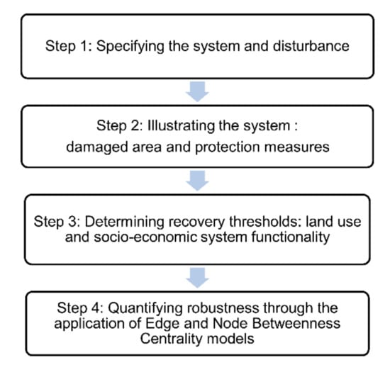 Figure 2 shows the steps to be taken when analyzing system robustness: (1) specifying the system and disturbance (i.e., transportation and flood-risk system), (2) illustrating the system response in terms of the damaged area as a function of floodwater levels and protection measures, (3) determining recovery thresholds based on land use and socioeconomic system functionality, and (4) quantifying robustness through the application of the edge- and node-betweenness centrality models [11].